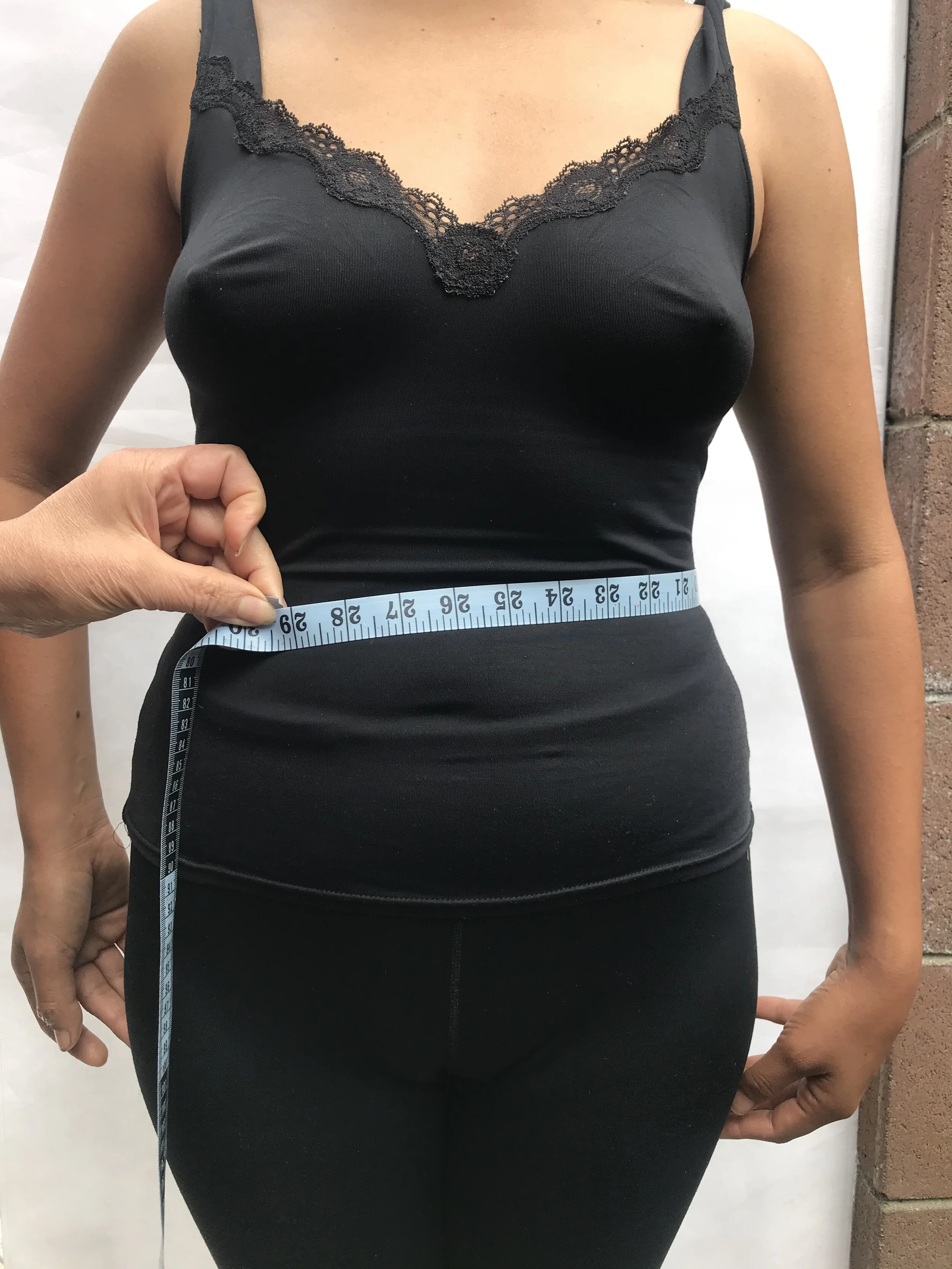 In the left image, you can see Violeta measures her waist at her TRUE waist, the point where any professional seamstress would measure you. Around the belly button.