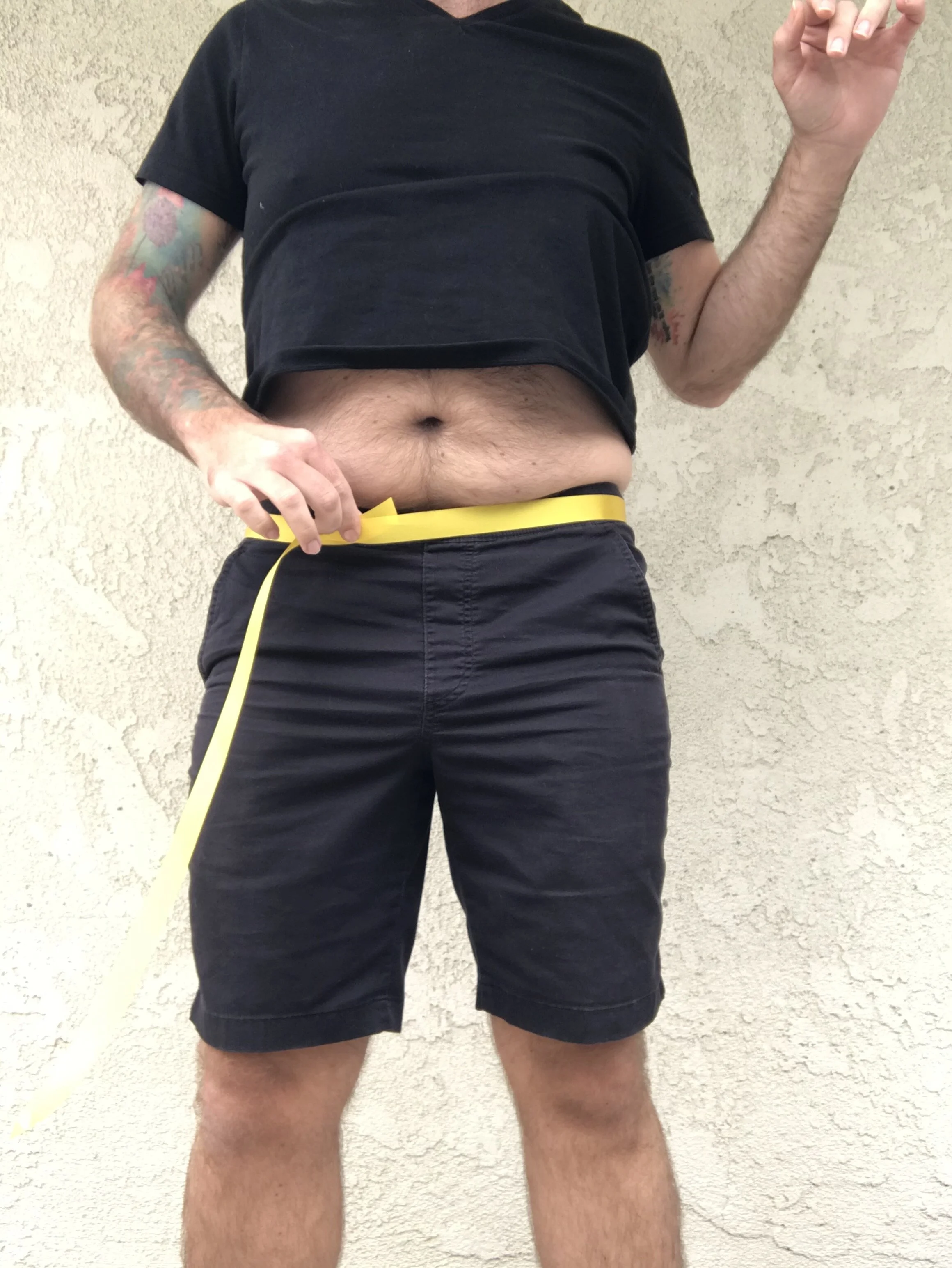 I’m not big on sewing either and I don’t have a cloth tape measure lying around my home. However, I do have a standard tape measure and some ribbon! If you have a ribbon or string that you can use to wrap around your body and mark, then you can place that string flat and measure how long it is using a standard construction tape measure. You can see below that I used a piece of yellow ribbon to measure my waist.
