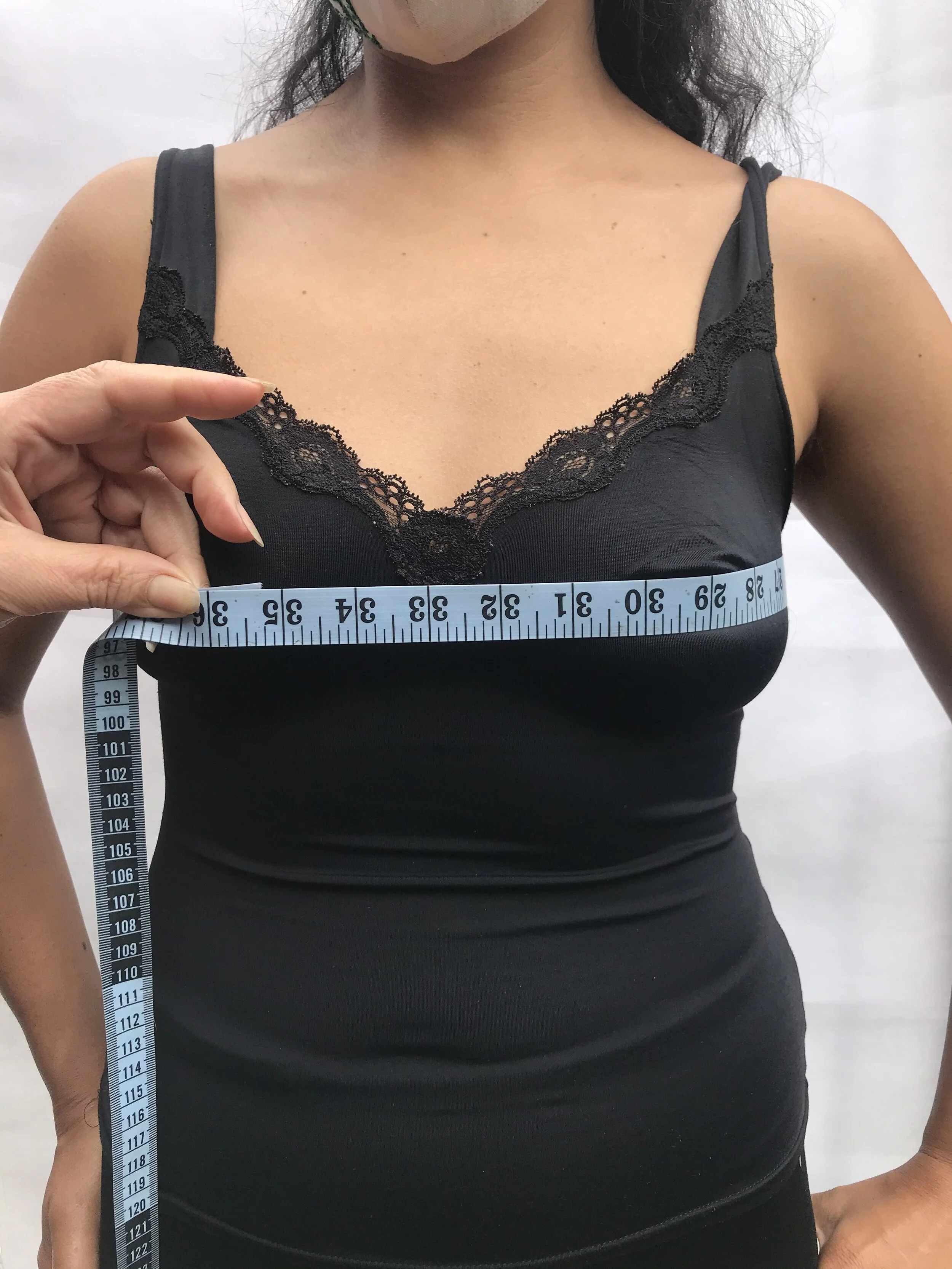 Measuring your hips, waist, bust, and torso is always best. We can never have too much information. For top suits like The Andrea Halter Crop and The Rax measure at the largest part of your chest, as you can see below. For one piece suits, like The Martina, be sure to measure your hips and torso- going all the way around your body like a loop, being sure to measure across the buttocks and breasts at the most voluminous area.