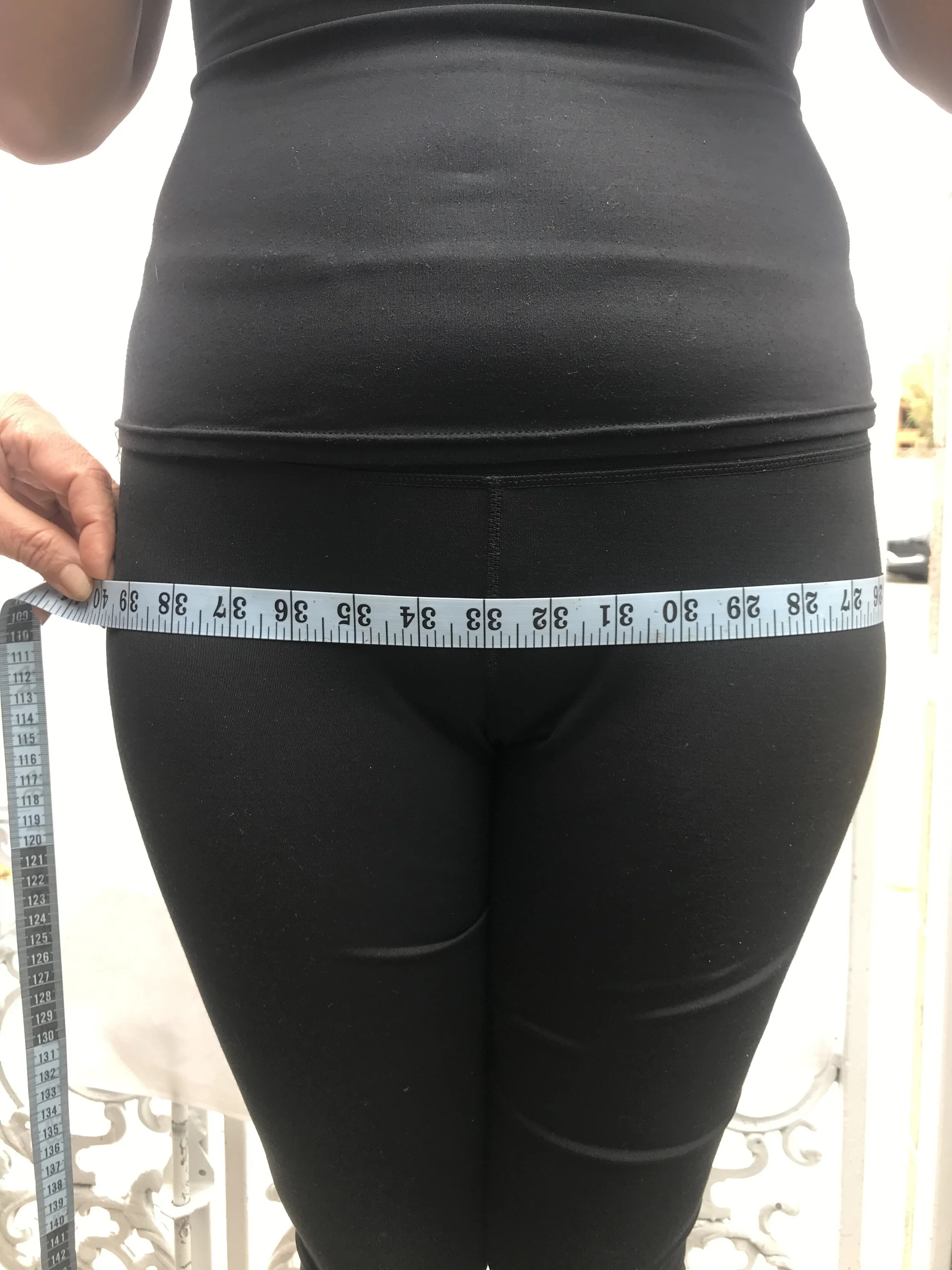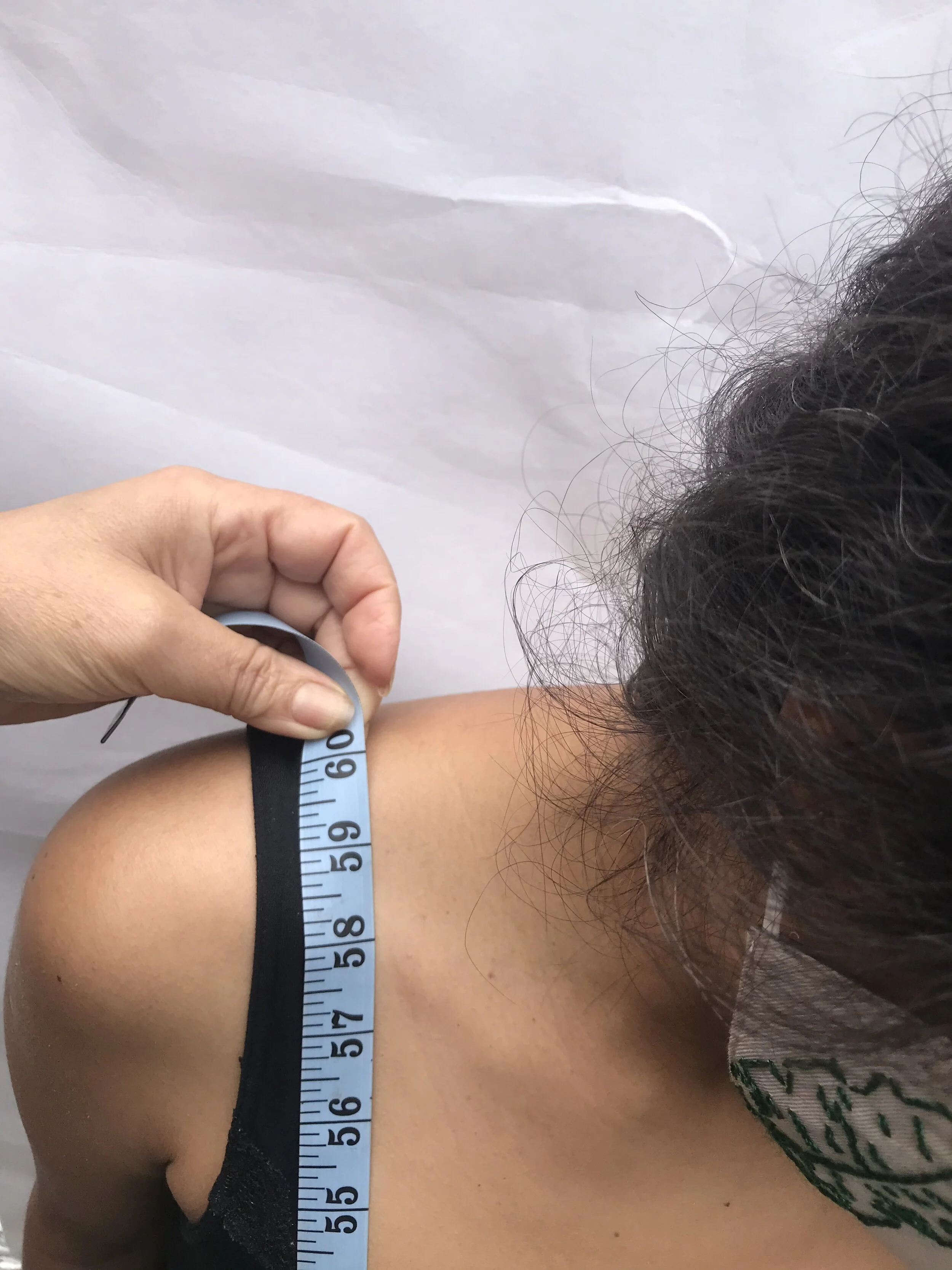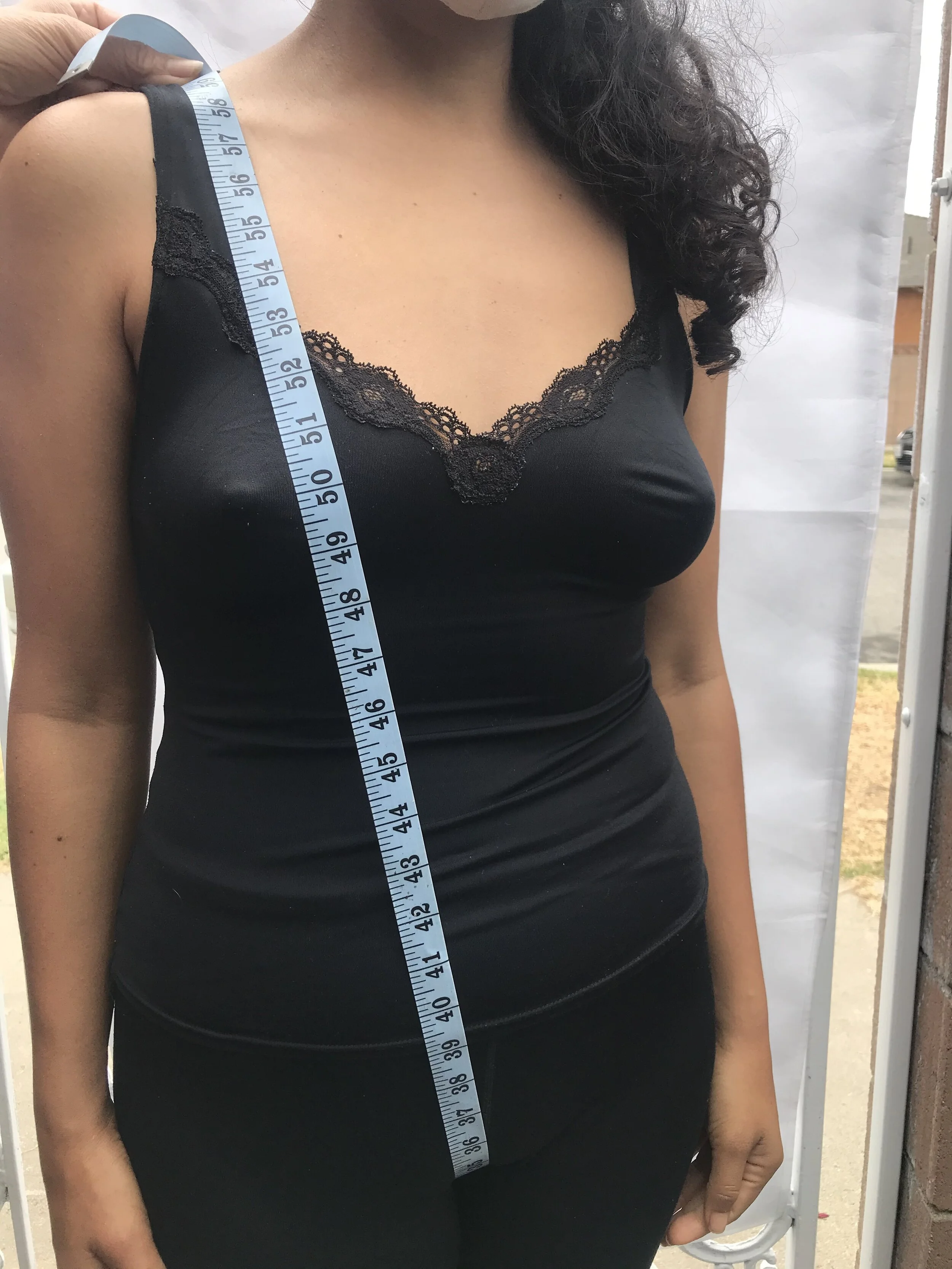 Creating a loop with the tape measure, go between your legs, across your buttock and breast at the fullest point (generally near the nipple).